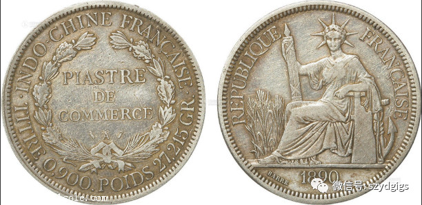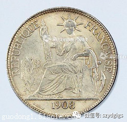 法属印度支那贸易银圆,俗称坐洋,为清末民初在华流通的外国银圆之一。银币正面为自由女神坐像,背面的装饰图案为麦穗,法文有“贸易银元”和“法属印度支那”等。银元正面希腊自由女神坐像,这也是“坐洋”得名的因素。