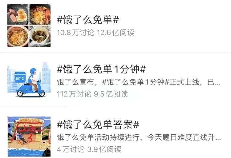 既可以享受美食,又能得到大额免单优惠的“一分钟免单”活动,短时间内就在用户群中成为人人热议的“爆款”话题。在庞大流量的推动下,“免单1分钟”相关话题,很快就登上了热搜榜,并且在10天的活动期间始终保持热度。从具体数据来看,仅在活动第一天,微博#饿了么免单事件#话题的阅读次数就达到惊人的12.6亿,讨论人数甚至比6月19日的#蜜雪冰城黑化#还要高,达到10.8万。