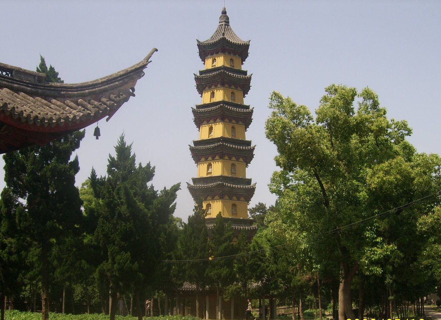 镇国寺塔在灌口场西南朝九陇郡故城遗址的白塔坪上,建于北宋至和元年至嘉祐五年(1054-1061)。塔高38米,呈密檐式十三级方形砖结构。内有五层塔室,登道相通,可盘旋至顶,观彭门雄姿与湔江秀色。