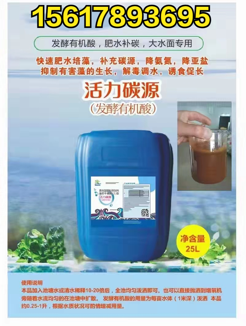 活力碳源〈发酵有机酸〉,用于大水面肥水,主要成分发酵有机酸、植物乳杆菌,还原糖等有机碳源,氮磷钾及有机质等。富含脱氮除磷所需碳源成分,可提高碳氮C比,调整水体微生物菌相,使得菌群更具多样性,保持更高的有益微生物活性。增加养殖水体必需的总养分及微量元素,促进浮游植物繁殖,有效肥水,维护菌藻平衡。