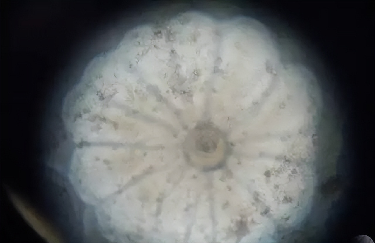 早期白斑病在头胸甲上可见到针尖样大小白色斑点,数量不多,不易观察到,此时对虾胃内还充满食物,头胸甲不易剥离。中晚期白斑病白斑大且连成片,严重的全身甲壳都有白斑,胃内空无食物,肝胰腺发白肿大等现象,头胸甲容易剥离。