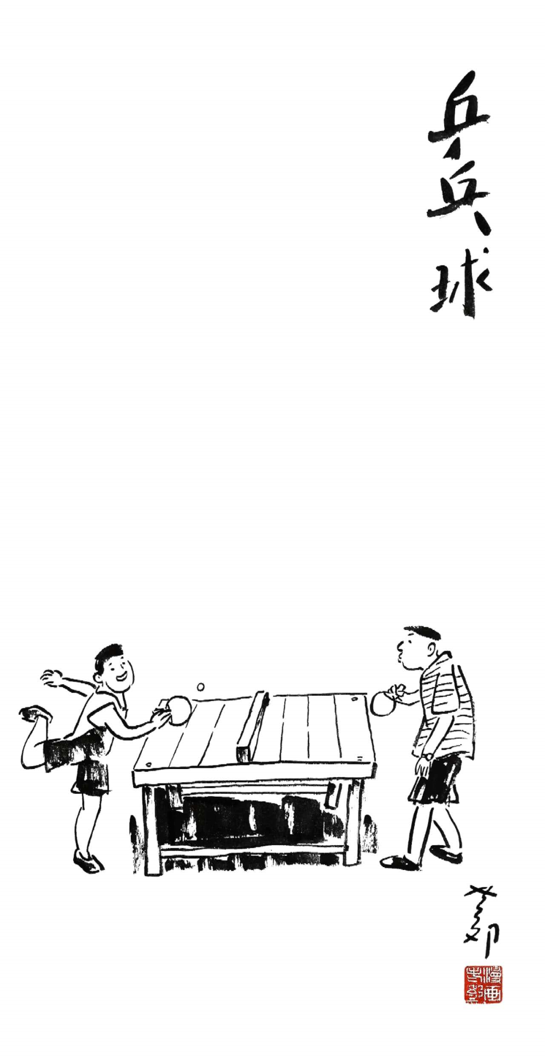 小孩子好不容易存的零花钱,只能买一只八分钱的乒乓球,其它的设备就只能因陋就简,将就着用了。没有球桌,就在晒场上画一张。用粉笔画最好,要是没有粉笔,用南瓜叶也行,要是连南瓜叶也没有,就用瓦片了。这样的影子“乒乓球桌”倒也简单,可有一个缺憾,就是乒乓球有没有出界,很难界定,双方往往公说公有理,婆说婆有理,争得面红耳赤,谁也不服谁。还有一种办法要好一点,临时将堂楼上的大门拆一扇下来,搁在两条四尺凳上,就成了一张简易的乒乓球桌。没有球网,在门板的中间放两块砖头,搁上一条木棍或者竹竿即可。没有球拍,就选一块长方形的木板,甚至用手掌。我因为不会握球拍,从小都徒手打乒乓球,只会托球,不会推挡抽杀,相当蹩脚。