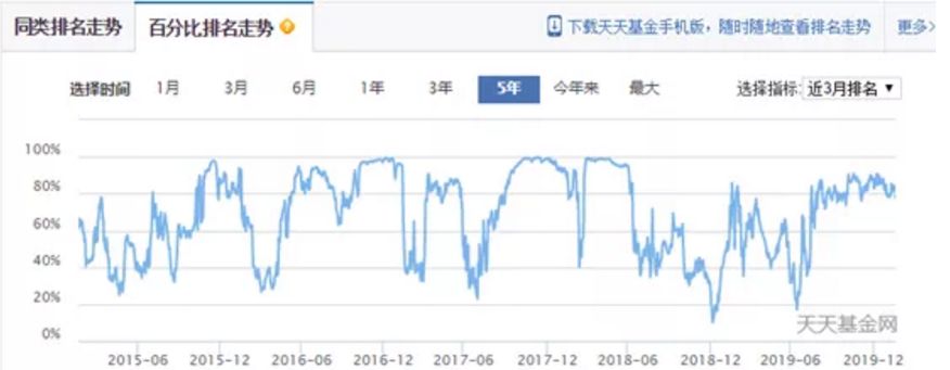 在基金页里面有一个基金的排名历史走势,看它近5年的排名,就很容易看出来这家基金目前是不是处于“表现不佳”的时候。