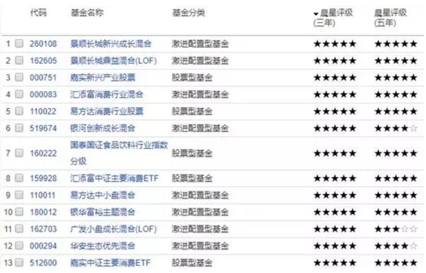 中期的维度主要看1年,这个维度的评级可以在东方财富的基金专栏看,获得两家以上的5星评级就可以入选。