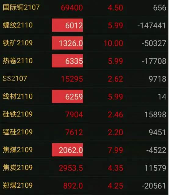 点评:昨天资源股又爆了,直接导火索就是期货暴涨。6000的螺纹、1300的铁矿石、2000的焦煤,近2700的玻璃,不断刷新历史极值,我们又在见证历史!其中铁矿石、螺纹钢、焦煤、玻璃都涨停了,这实在太疯狂,期货可是有5-10倍杠杆,一天涨10%最高赚翻倍了。