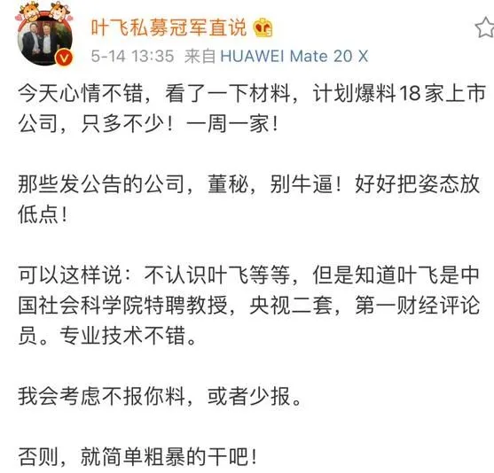 这次算捅出了一个马蜂窝,除了中源家居,叶飞已点名的包括:隆基机械、维信诺、昊志机电等。他还放话有几百G的料,准备爆料18家上市公司,只多不少。很多上市公司董事长要瑟瑟发抖了。