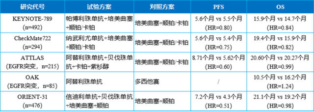 在这之前,众多药物曾在III期研究中有过破局尝试。PD-(L)1单抗是最早的探索者,包括帕博利珠单抗[3]、纳武利尤单抗[4]、阿替利珠单抗[5,6]和信迪利单抗[7]四款药物已有III期研究结果披露,但无一能够取得PFS和OS双重获益的结果。