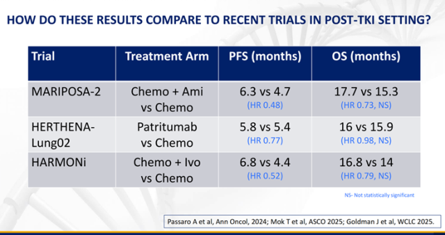 在大会上,EGFR-TKI耐药后非小细胞肺癌(NSCLC)群体的未满足需求再度引起广泛关注。尽管多款药物在会上展现出了极具潜力的临床数据,但遗憾的是,直到大会落幕,也并未出现一种疗法能够相较于标准化疗同步实现无进展生存期(PFS)与OS的双重获益[1]。