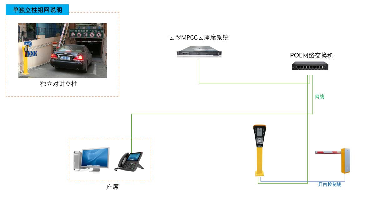 在云端部署云翌MPCC云座席系统,和业务系统集成在一起,前端一键呼叫,后端系统自动联动停车场相关信息,方便停车场实现远程停车管理。