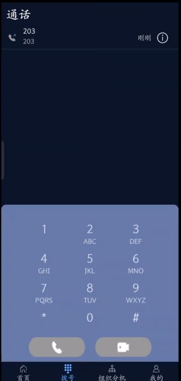 点击进入拨号管理页面,界面显示拨号盘,以及历史记录信息,拨打电话时,直接输入号码,即可发起呼叫,同时支持视频和语音通话。