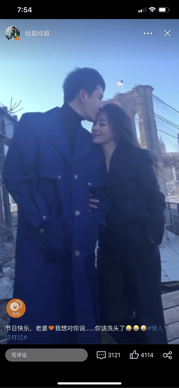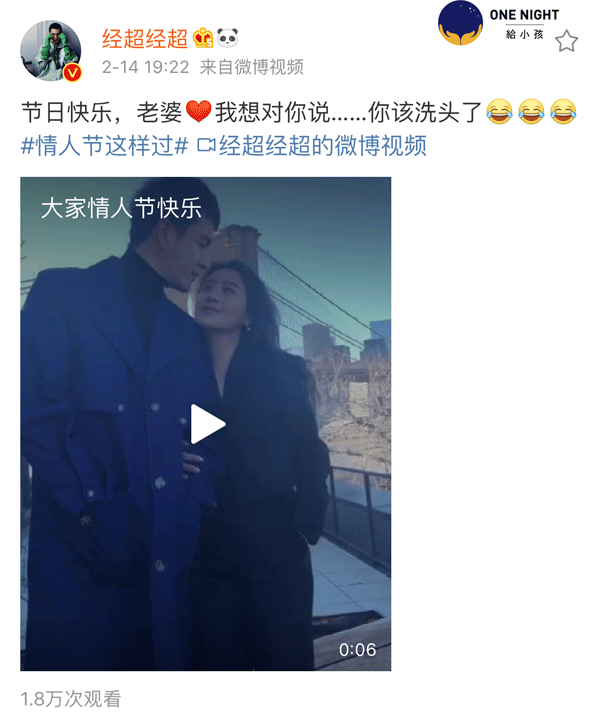 新娱中国讯 2月14日情人节,演员经超在社交平台发布表白视频,视频中经超和小李琳甜蜜相拥,经超更深情的亲吻爱妻的额头,如此甜蜜的情景,没想到调皮的经超却配文:“节日快乐,老婆,我想对你说,你该洗头了~”引得网友纷纷表示“经四龙你要笑死我了”、“经超你敢正经一秒么”,也是非常爆笑了。