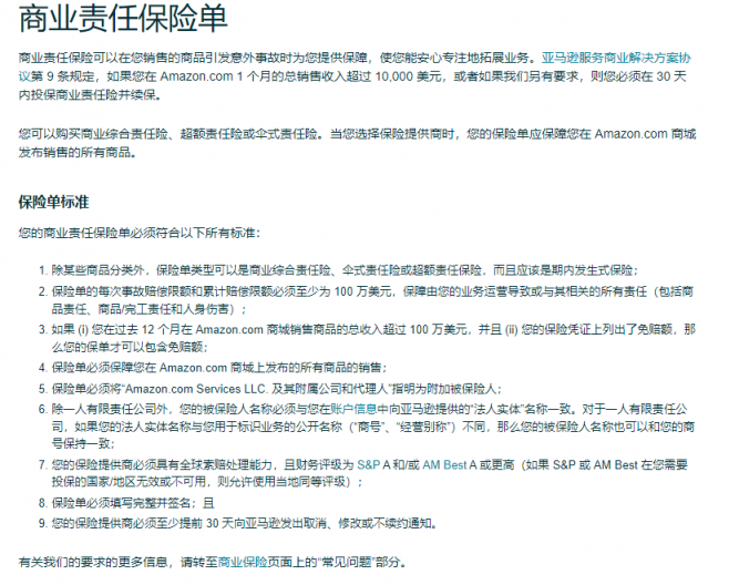 其实,原因是亚马逊调整了保险政策。之前,亚马逊只规定,如果您在Amazon.com 1个月的总销售收入超过$10,000,则必须在30天内投保商业责任险并续保,不限制是否有免赔额,两个方案都可以选择。而现在,亚马逊对商业责任险对保单有了新的要求:
