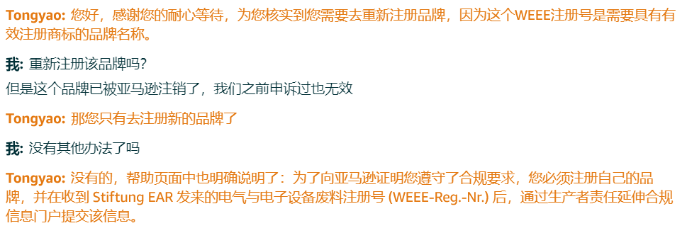 开case问客服是否可以用旧品牌去另一个店铺注册WEEE,客服的答复是:请注意,在我们解决这个问题之前,你必须先解决你的旧品牌违规问题。