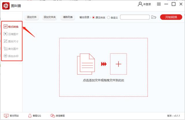 首先,我们打开软件,一共有五个功能,分别是:格式转换、压缩图片、更改尺寸、美化图片以及添加水印,在这里我们选择格式转换功能。
