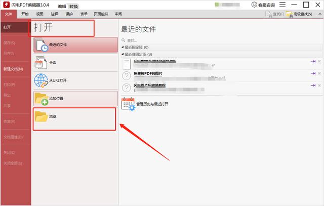 1、首先,我们打开闪电PDF编辑器,点击浏览-打开,选择你需要编辑的PDF文件。