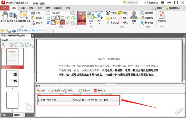 PDF文件我们接触的多了,关于编辑PDF文件的话,我们都知道需要借助PDF编辑器是最简单的方法,今天,小编突发奇想,能不能利用给PDF文件添加附件的方法给PDF文件添加一段音乐呢?实现这个之前,先和大家分享我使用的PDF编辑器,它就是闪电PDF编辑器,它操作简单,功能强大,不仅具有编辑PDF文件的功能,还具有PDF文件合并,添加水印、加密等操作。下面我们来看看看怎么利用闪电PDF编辑器来给PDF文档插入一段音乐吧。