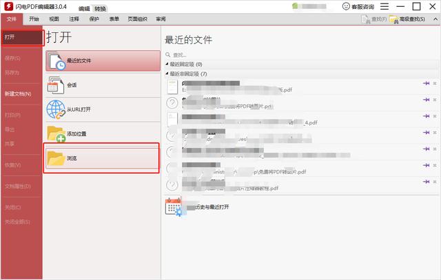 1、安装闪电PDF编辑器后打开软件,然后点击”打开“-”浏览“打开我们需要编辑的PDF文档。