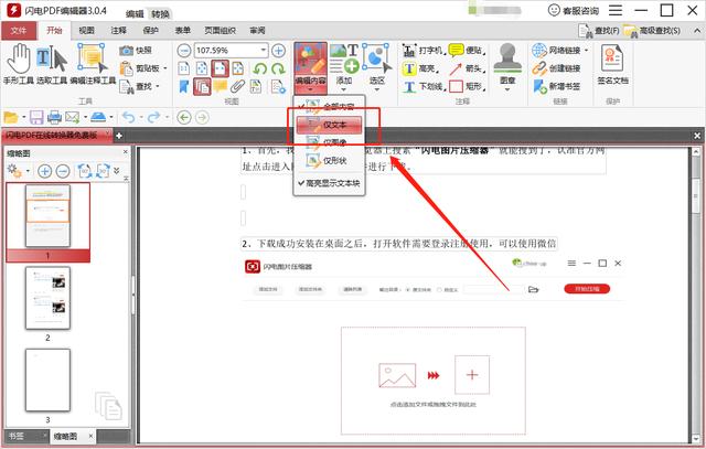 2、打开我们需要编辑的PDF文档后,选择“编辑内容”-“仅文本”。