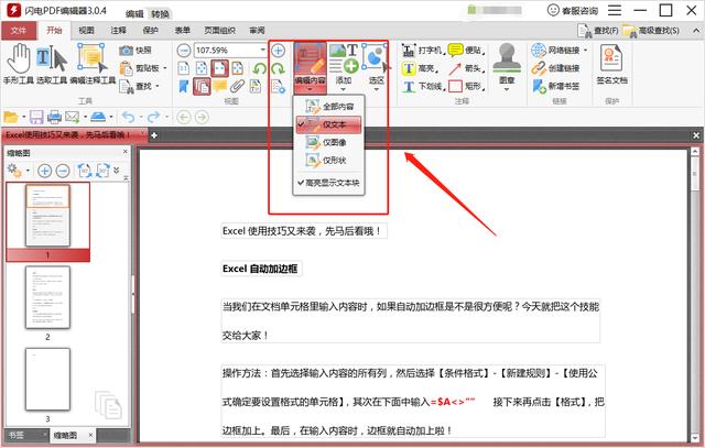 第二步、打开PDF文档后,选择工具栏中的“开始”-“编辑内容”-“仅文本”。
