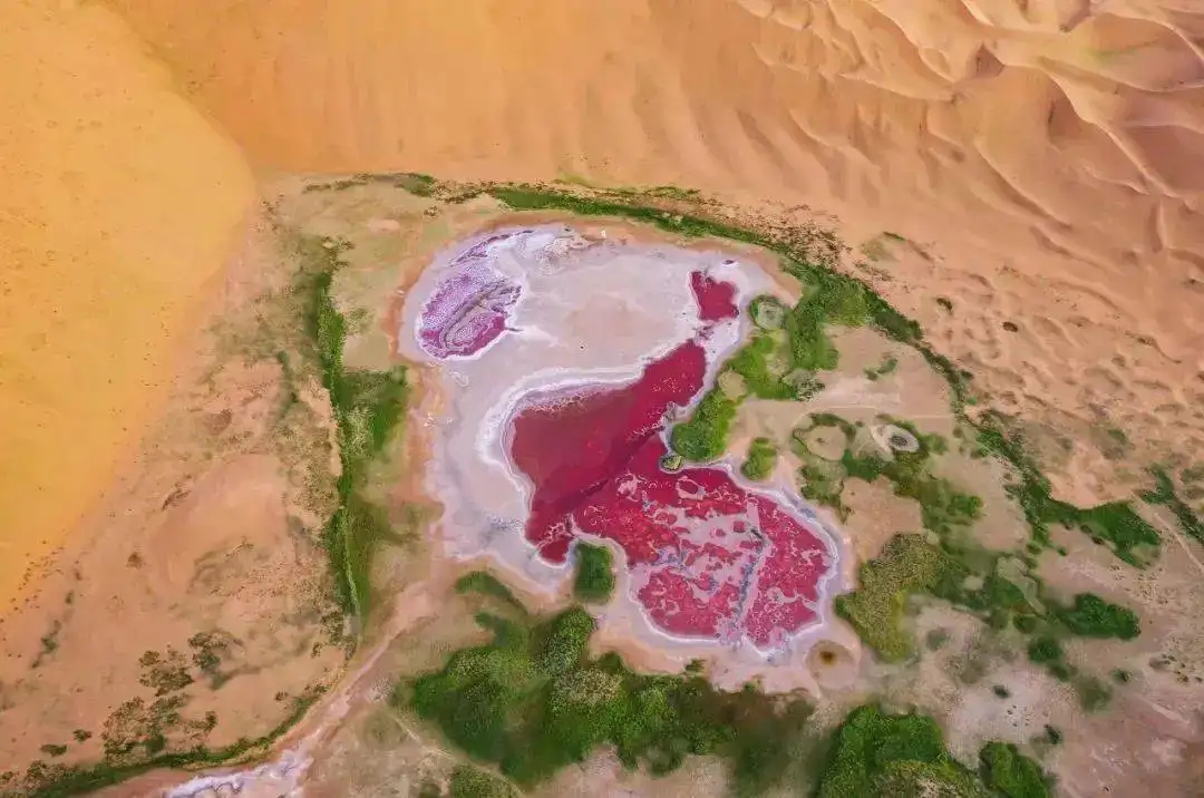 在巴丹吉林沙漠深处,达格图湖宛如一颗红宝石镶嵌于此,梦幻的粉色湖泊被当地人亲切地称之为“红海子”。