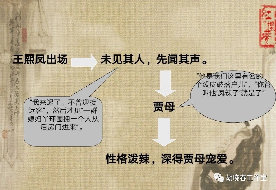 后来作者用了比较大的篇幅描写了王熙凤,“一双丹凤三角眼,两弯柳叶吊梢眉,身量苗条,体格风骚,粉面含春威不露,丹唇未起笑先闻。”王熙凤的出场很有特点,未见其人,先闻其声,而且能在贾母面前笑的那么大声的人,可见在家中的地位肯定不一般。