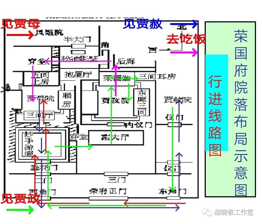 2、与邢夫人一起去见贾赦见贾赦:出西角门→出荣国府正门进宁国府→入一黑油大门中→至仪门前→贾赦院内。