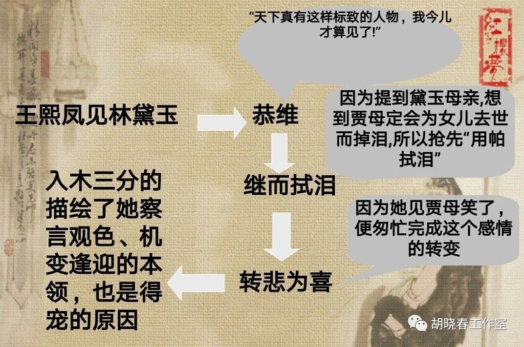 一见面就夸林黛玉长的标致,能讨得贾母欢心。她原以为贾母看见黛玉会伤心的,所以刚开始她假装伤心,后来贾母说自己刚好点,黛玉也刚好点,叫她别再提,她马上能转悲为喜,就把话题给转了,关心黛玉,责问婆子,可以看出王熙凤,为人处世,以贾母为主,拍贾母马屁,做事干练,安排妥当。