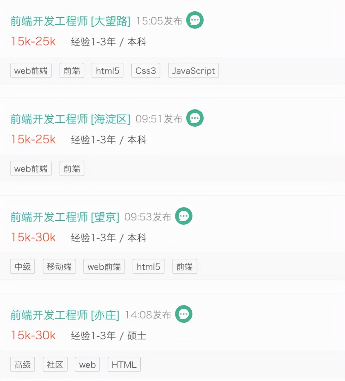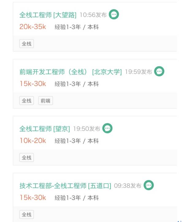 以下为在某主流互联网行业招聘网站上,搜索“前端”限定“3年及以内”经验后最先出现的4份岗位待遇信息。下文中后端、全栈薪资信息截图条件相同。