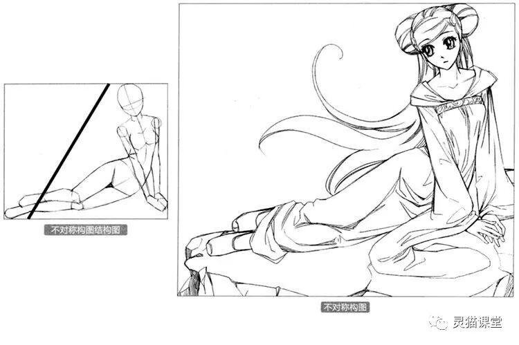 对称构图在人物轮廓上可以是一致的,但是在绘制人物的衣服和头发上则可以采取互补的形式。