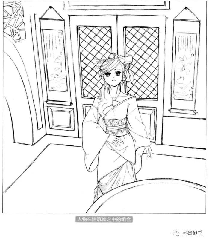 表现人物在建筑物内的画面时要注意透视和景深,不要把人物和建筑物花的粘连在一起了。