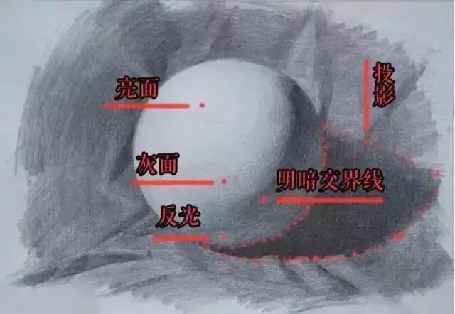 物体在光线的照射下产生了明暗物体都是有许多大小不同的面组成的各个面的方向不同,接受光线的角度也不同就形成了深浅不同的层次,一般称为“明暗五调子”即亮面、灰面、明暗交界线、反光、投影。