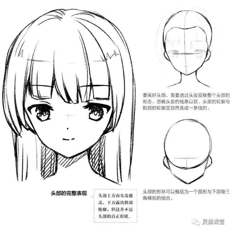 注意头颅的形状一定是椭圆形,一些初学者容易画成圆形,进而让整个头显得扁平,没有后脑勺。