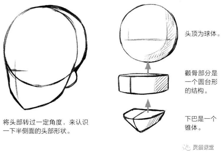 将头部转过一定角度,来认识一下半侧面的头部形状。(头顶为球体。颧骨部分是一个圆台形的结构。下巴是一个锥体。)