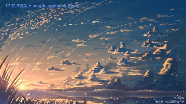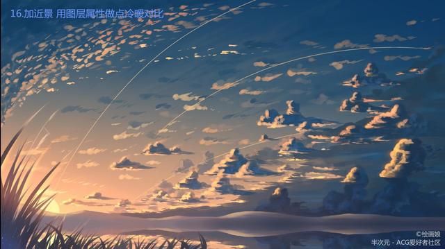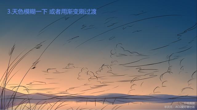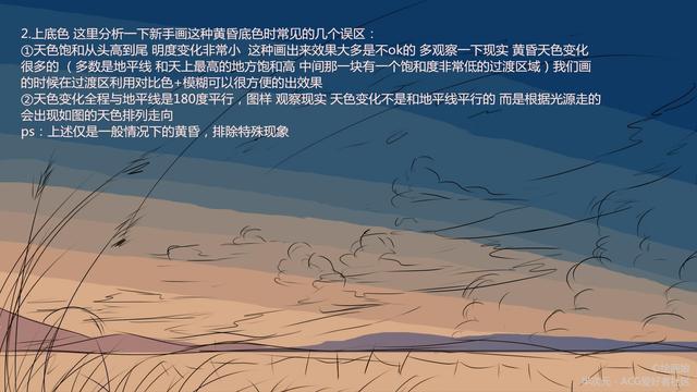 1.天色饱和从头高到尾,明度变化非常小,这种画出来效果打多是不ok的,多观察一下显示,黄昏天色变化很多的(多数是地平线,和天上最高的地方饱和高,中间那一块有一个饱和度非常低的过渡区域)我们画的时候在过渡区利用对比色+,模糊可以很方便的出效果