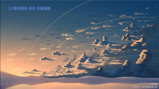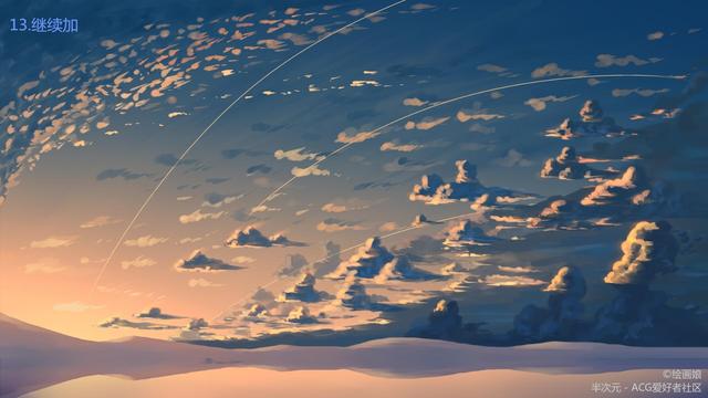 加云,丰富画面,注意云的排列,不同类型的云有各自的在天空的先后高低顺序,这个涉及的点比较多我也不敢乱讲,建议上网查,多观察现实