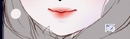 2、用喷枪(正片叠底)(这样子 很方便,不需要再新建层)在嘴唇中间加点粉红,但别太过头!然后把嘴唇的轮廓擦出来。轮廓这块你可以看到我做得很浅.