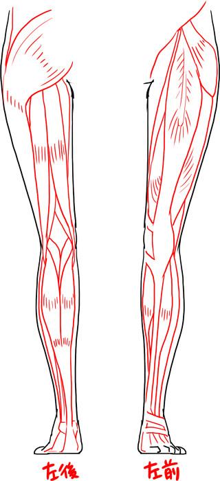 在此图中,根据典型插图的头部和身体绘制肌肉。左侧是从后面看的左腿,右侧是从前面看的左腿。大块的肌肉表现为不规则的皮肤表面。