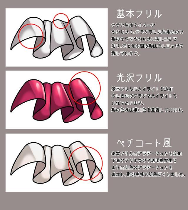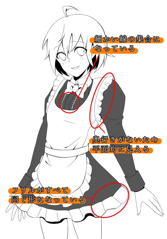 如果仅画出多余的褶边,它们的外观就会与裙子和围裙不同。很好地绘制每个形状是很好的,但是同时让我们知道“褶边是附着在身体上的一块布”。