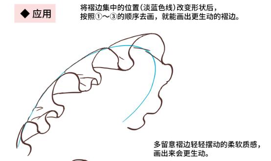 http://p1-tt.byteimg.com/large/pgc-image/c8a43cb3325a45cd85c727bd0093fc5d?from=pc将褶边集中的位置(淡蓝色线)改变形状后,按照~的顺序去画,就能画出更生动的褶边。