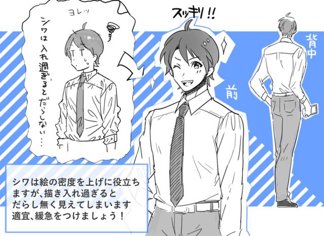 如果在“衣领”,“袖口”,“纽扣区域”等上用与身体和袖子相同的力画出皱纹,则可能会失去真实的印象。
