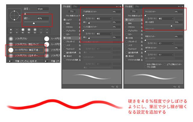 http://p1-tt.byteimg.com/large/pgc-image/192bd48b3ba647ad85da3a09063974ba?from=pc基本形状是预设的硬圆形笔刷(书写压力不透明度),但是要调整硬度和形状项目,并添加设置以使线条绘制在书写压力下略微变细,而边框略微模糊。