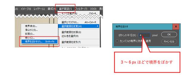 http://p1-tt.byteimg.com/large/pgc-image/364f998ab7814006ac7f0213900e69f8?from=pc创建选择区域后,如果保留原样的边框,则太清晰了,因此从选择区域菜单中选择“更改选择区域”→“模糊边界”,并以3到6 px的距离稍微模糊它。