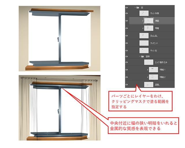 http://p1-tt.byteimg.com/large/pgc-image/9cf723a4f1dd4f6fbd853edd89ff2a9a?from=pc将窗框分开,然后将窗扇分成多个部分并上色。窗扇涂有金属材料(例如铝),而框架则涂有木材。 要创建金属质感,可以通过使用稍窄的明暗来创建反射性气氛,以使中心附近的区域变亮。两侧的窗帘都是不可见的,因此无需详细画图。