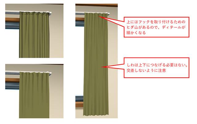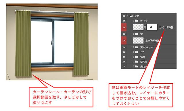 让我们将窗帘上的阴影放在后墙上,就像窗框上的阴影一样。通过添加阴影,您可以使其看起来像墙壁和窗帘之间有缝隙,从而产生距离感。