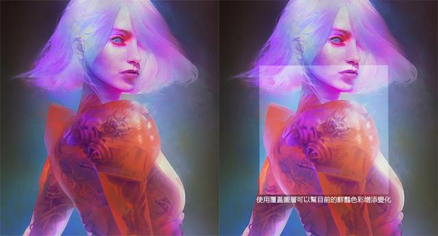 在数位绘图中,色彩鲜艳度的原则可以简单地归纳为在绘制时,把颜色最浓的图层安排在最上方。摆在最上方的图层颜色和比重越强,图画就会看来越显眼,能营造出对比度。在决定好构图后考虑这项原则,就可以自然地为呈现的图像和色彩选择带来正面的影响。