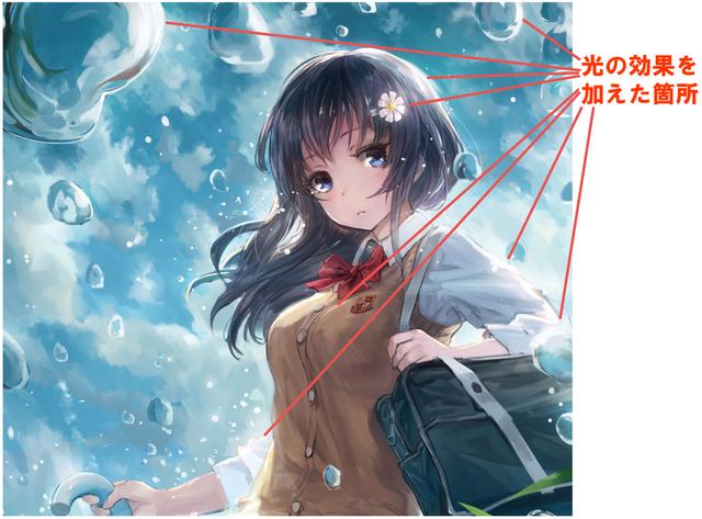 在顶部的[添加(发射)]模式下创建一个新层,并使用S-Air笔刷添加强调反射的效果。主要显示灯光效果的地方如下所示。