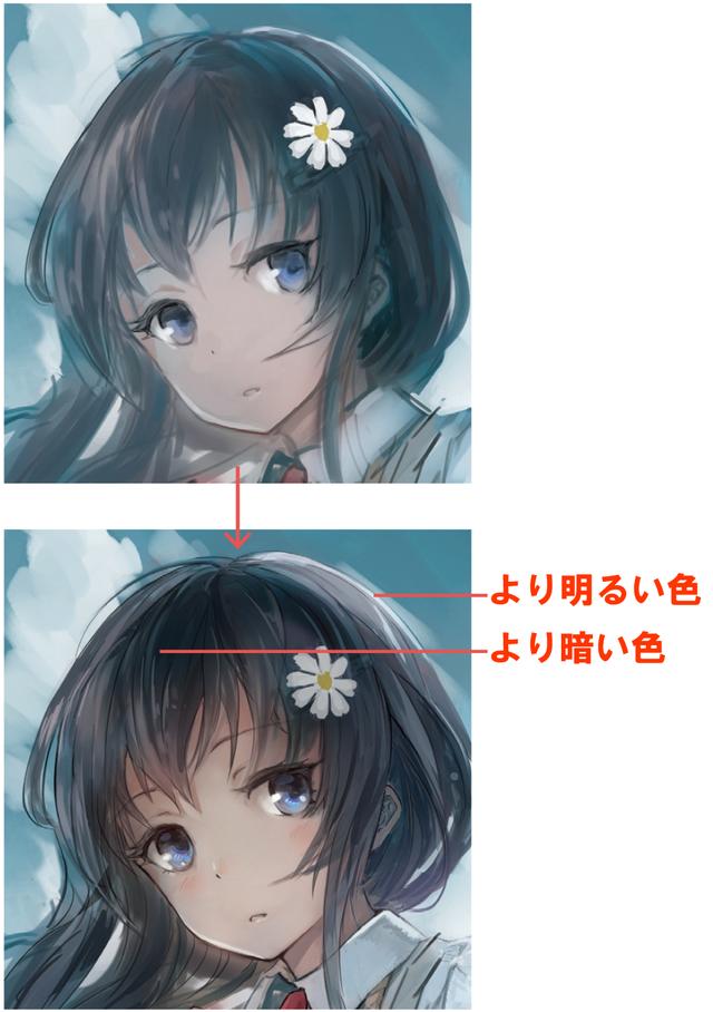 这次,图像从左上方闪耀,因此我在女孩的右下方周围添加了强烈的阴影。
