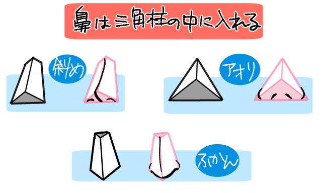 它是一个三角形的棱镜,底部较粗,顶部较薄,鼻梁的最高部分。如果您决定鼻梁的位置(鼻纹)和到眼睛的距离,即使改变角度也很难像另一个角色。