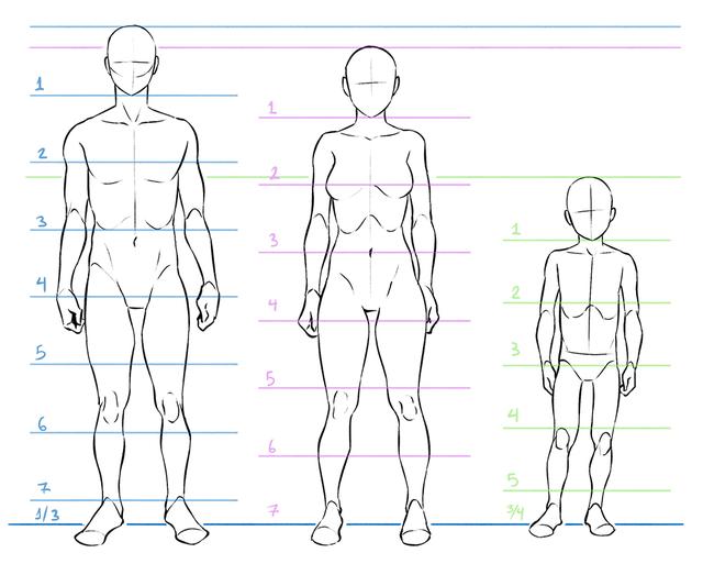 为了证明这一点,让我们看下面的例子:两个成年人,一个男人和一个女人。尽管女性身材矮小,但她的身体被分为7个头(符合标准),男性身高仅高了三分之一。