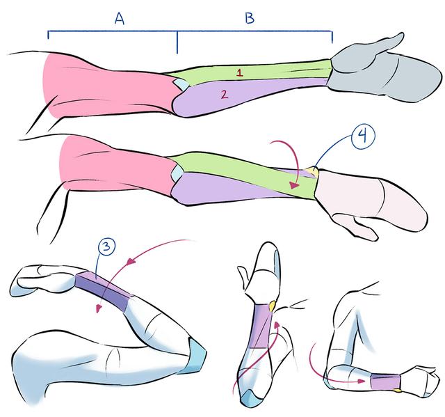 在前臂中,您会发现the骨(1)和尺骨(2)。这些骨头交叉以允许手腕旋转。一些艺术家将前臂的一部分绘制为盒子以定义其体积(3)。